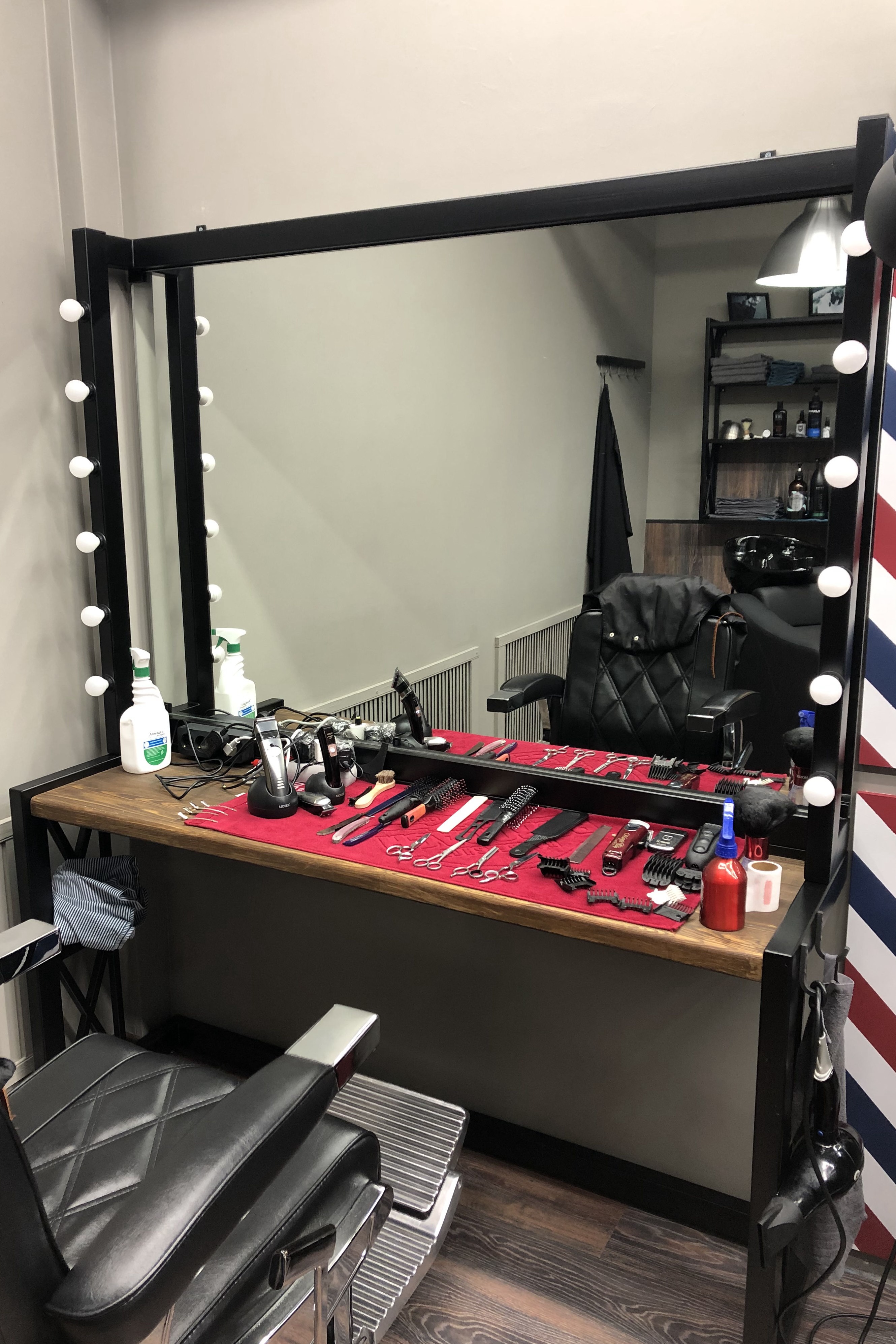 В салоне Бородач стояла задача изготовить всю мебель и освещение, было изготовлено шесть рабочих мест включающих рабочий стол и зеркало, рабочие полки мастеров, шкаф, стеллаж по кофе машину, стеллаж и полки под полотенца и расходники, журнальный столик и стол под игровую консоль, стеллаж под книги и интерьерный декор, торшер, перегородки, а также полное освещение рабочих мест мастеров.
