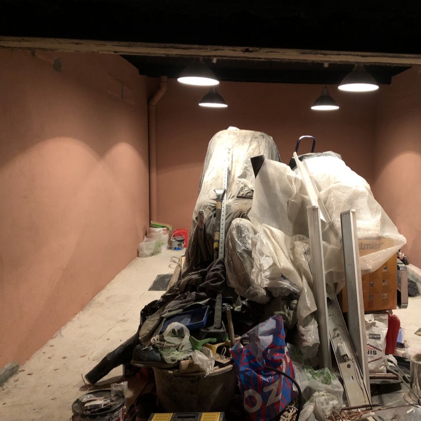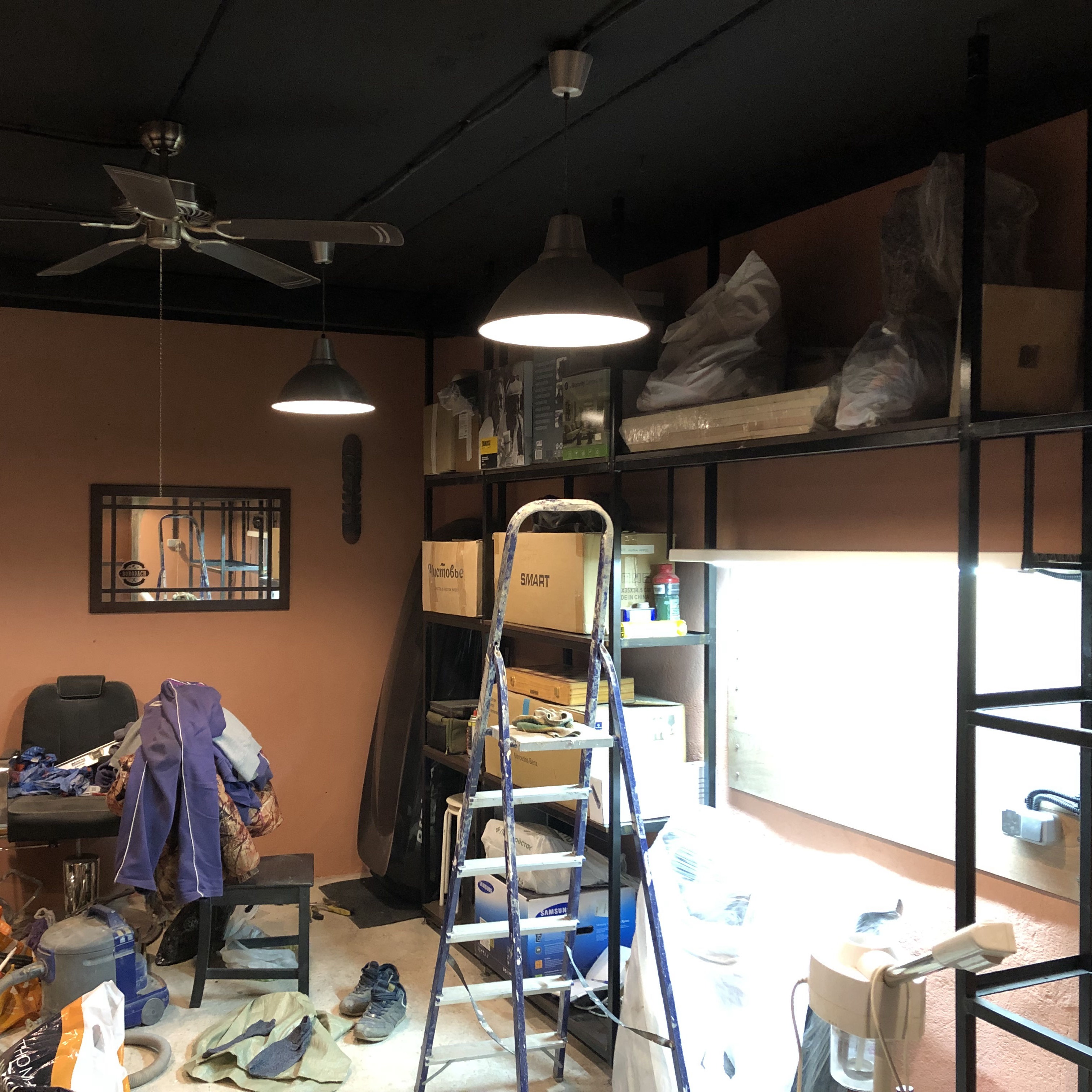В гараже по желанию клиента нужно было сделать атмосферненький ремонт с минимальными затратами. Были очищены стены и потолок от старой краски, под которой обнаружилась штукатурка советского времени, пришла идея покрасить все фасадной краской в цвет приближенный к кирпичному, потолок покрасили фасадной краской черного цвета, сделана новая электрическая проводка по всему гаражу, изготовлен стеллаж на длину практически всей стены, увеличен проем въездных ворот на 25 см и изготовлены и установлены новые ворота.